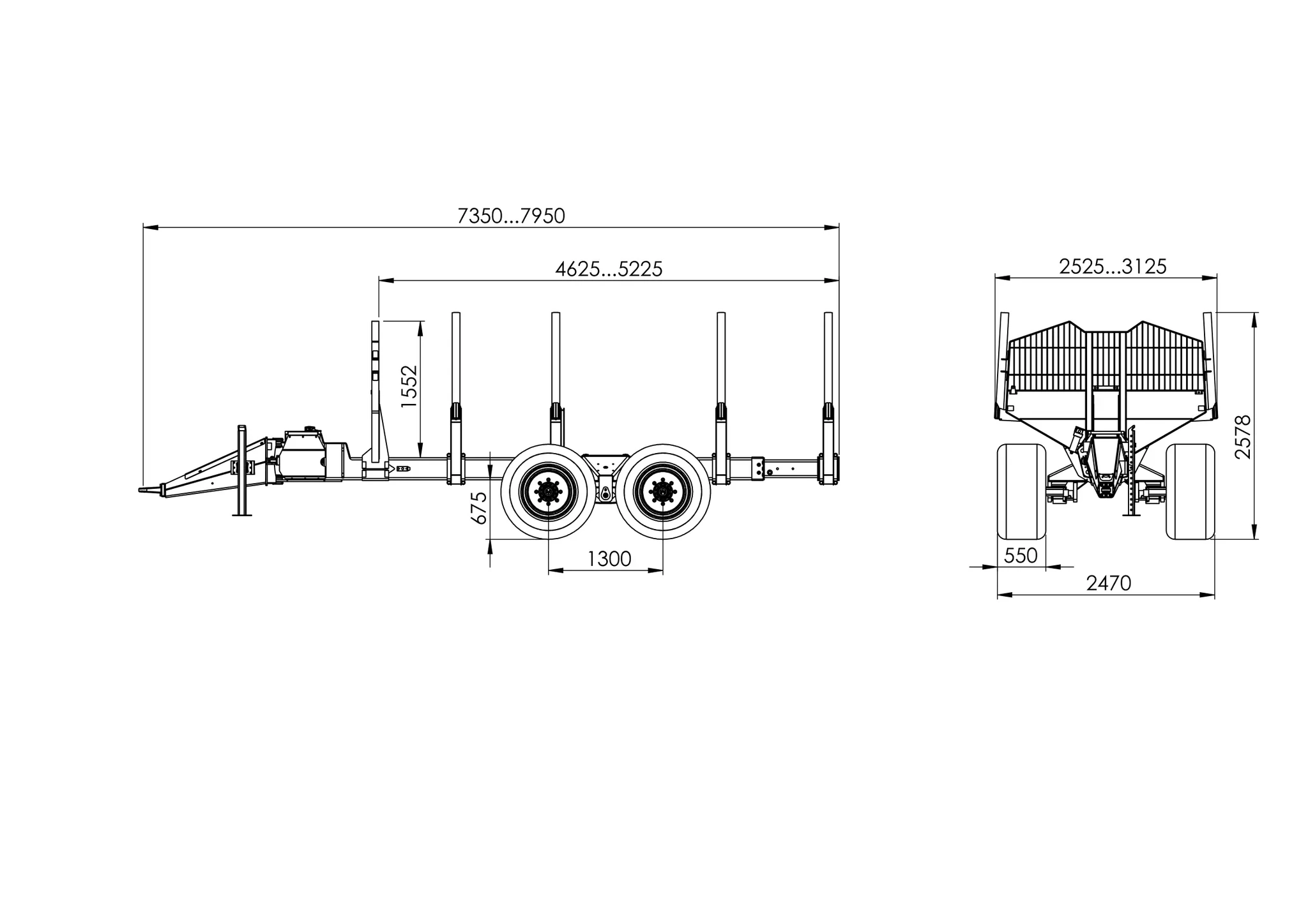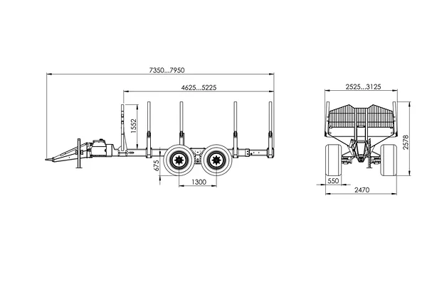 Alla BMF-timmersläp kan utrustas med en ramförlängning för att öka lastutrymmet och transportera fler eller längre stockar. Ramförlängningens maximala längd beror på modellen av timmersläp. Vi rekommenderar att du monterar ytterligare en uppsättning stöttor och en uppsättning stolpar till förlängningen. (Förlängningarna för timmersläpen BMF16T1 och BMF18T1 är hydrauliskt rörliga.